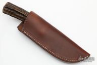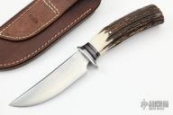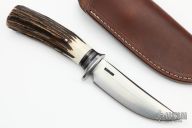 This Hunter by Mike Malosh features a satin finished convex ground blade with .167" blade stock and 1.181" blade depth, hidden tang construction. The handle has a stainless steel guard, stag grip with black, red and aluminum spacers. Comes with a brown leather sheath. New from maker at the 2022 Blade Show.