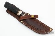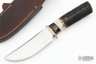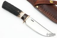 This Hunter by Mike Malosh features a satin finished convex ground blade with .165" blade stock and 1.390" blade depth, hidden tang construction. The handle has a brass guard, stag grip with black and brass spacers. Comes with a hand tooled brown leather sheath. New from maker at the 2022 Blade Show.
