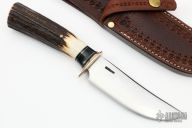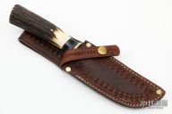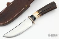 This Hunter by Mike Malosh features a satin finished convex ground blade with .168" blade stock and 1.376" blade depth, hidden tang construction. The handle has a brass guard, stag grip with black and aluminum spacers. Comes with a hand tooled brown leather sheath.  There is a small crack in the handle of the knife.  New from maker at the 2022 Blade Show.