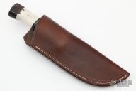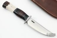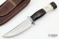 This Scagel Hunter by Mike Malosh features a satin finished convex ground blade with .193" blade stock and 1.144" blade depth, hidden tang construction. The handle has a stainless steel guard, stag butt and a spacer pattern consisting of black/aluminum/micarta/copper. Comes with a brown leather sheath. New from maker at the 2022 Blade Show.