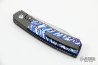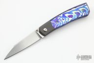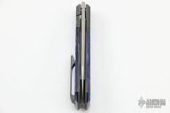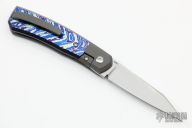 This Canibl by Suprlativ Knives features a hand rub satin finished blade with a notched front flipper. The handle has a bead blasted titanium frame, mokuti scales, titanium backspacer with lanyard pin and tip up clip with hidden screws. Rides on bearings, nice detent, lockup and blade seating. Has stainless lockface insert. Comes with original box. New from maker at the 2022 Blade Show. This one is #3 of 20.
