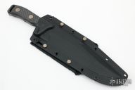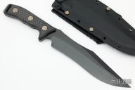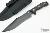 This Arbiter by Microtech features a two-tone DLC recurve blade with a notched thumbrest and sharpened top edge. The handle has carbon fiber scales with bronzed hardware, .213" blade thickness and 1.896" blade depth, full tang construction. But has a lanyard hole. Comes with kydex sheath with MOLLE locks. Comes with original box. Serial number 043 and dated 04/2022. New condition.