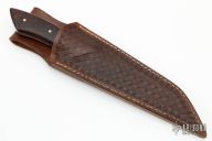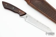 This knife by Master Smith Murray Carter features a San Mai Damascus blade with .132" blade thickness and 1.138" blade depth, full tapered tang construction. The handle has desert ironwood scales with red liners, nickel silver and mosaic pins. Comes with brown leather sheath. Has some light oxidation on the tang, otherwise excellent condition.