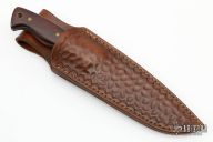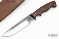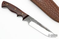 This knife by Master Smith Murray Carter features a stainless clad San Mai blade with .126" blade thickness and 1.231" blade depth, full tang construction. The handle has cocobolo scales with brass pins. Comes with brown leather sheath. Excellent condition.