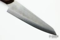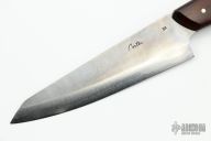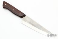 Murray Carter's Honesuki  is hand forged from stainless carbon laminated steel with a White steel (W) core laminated between SUS410 stainless mild steel for ease of maintenance. This steel affords the keenest possible edge. 160mm cutting edge, .113" blade stock and 1.650" blade depth, full tapered tang construction. The handle has desert ironwood scales with nickel silver pins. Comes with original box. Excellent condition.