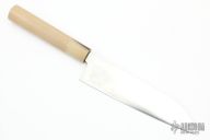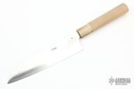 Hand forged, hand polished, Hitachi White Steel #1 Core laminated between SUS410 stainless mild steel for ease of maintenance. The blade is permanently attached to the bolster and handle with epoxy cement. The Funayuki is a general purpose chef's knife. Murray's High Grade Series is the next step up from his Stainless Fukugo-zai Series of knives. A fine kitchen/chef's knife. Extremely sharp. 193mm cutting edge, .095" blade stock and 1.817" blade depth, hidden tang construction. Honey horn bolster and maple grip. Comes with original box. Excellent condition.