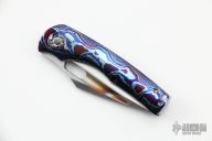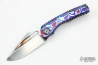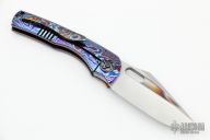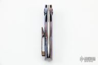 This BBM V2 by Nick Chuprin and Robert Carter features a hand rub satin finish blade with fullers, thumbhole and milled bevels. The handle has a contoured mokuti frame, Titanium hardware, Two piece titanium pivot with inlay, zircuti backspacer and tip up clip with hidden screws. Rides on Skiff Made bearings, nice detent, lockup and blade seating. Comes with a hard plastic case. Has a couple light scratches, otherwise excellent condition.