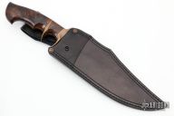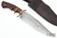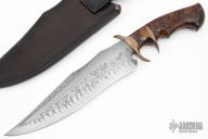 This Sub-Hilt Fighter by Jan Hafinec is magnificent! It features a recurve blade (C105 Carbon Steel) with amazing hamon and sharpened top edge, .223" blade stock and 2.196" blade depth, hidden tang construction. The handle has a bronze guard and sub-hilt with an ironwood burl grip, brass pin. Comes with a nice black leather sheath and a zippered case. New from maker. The hamon on this knife looks like the fires of hell!
