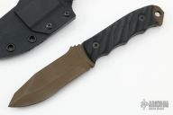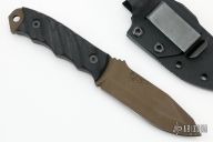 This Crow Jr by Half Face Blades features a bronze cerakoted drop point blade with a full tang construction.  .155" Blade Stock.  1.2" Blade Depth.  The handle is composed of contoured G-10 scales.  Comes with a kydex sheath.  Has some sheath marks otherwise excellent condition.
