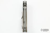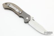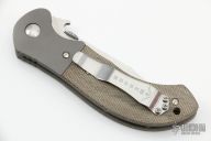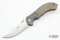 This custom Appalachian by Ernie Emerson features a satin finished clip point blade, dovetailed bead blasted titanium bolsters, and green micarta scales. Stainless steel clip, tip up carry. Has thumb disc and wave feature. Includes original box. Brand new from maker at the 2022 Blade Show.