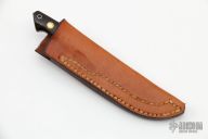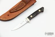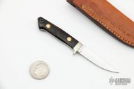 This miniature Drop Point Hunter by Hiroaki Ohta features a mirror polished blade with a full tapered tang construction,  .071" Blade Stock.  .355" Blade Depth.  The handle features a nickel silver guard with black linen micarta scales over red liners.  Includes a brown leather sheath and a zippered case.  Excellent condition.