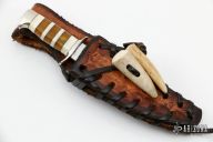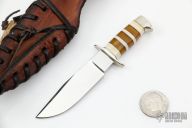 This Miniature Bowie by D'Alton Holder features a mirror polished blade, .109" blade stock and .574" blade depth, hidden tang construction. The handle has nickel silver guard and butt, and mammoth ivory and amber grip. Excellent condition. Comes with a brown leather sheath and zippered case.