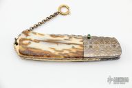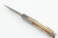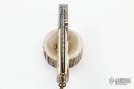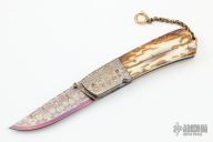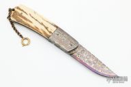 This knife by Johan Gustafsson features a colored Damascus blade with a single gold thumbstud with emerald inset. The handle has matching Damascus bolsters, mammoth ivory scales, gold plated screws, fileworked titanium liners, fileworked gold plated stainless steel backspacer. Makers name is engraved inside backspacer. Nice detent, blade seating and lockup. Excellent condition. Comes with a zippered case.