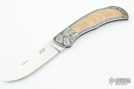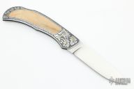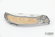 This Interframe lockback folder from Jack Busfield features a hand rub satin finished blade with nail nick. The handle is comprised of an engraved and gold inlaid stainless steel frame with mammoth ivory inlays and stainless steel lock spring. Excellent condition. Includes zippered case. The handle has been engraved by S. Lytton. Marked 05/93 inside backspacer.