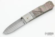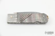This lockback by Barry Davis features a Damascus blade with fileworked spine and a single Damascus thumbstud with black stone set in a gold bezel. The handle has fluted Damascus bolsters, fluted black lip pearl scales, gold pins, toothpick and lanyard bail, fileworked nickel silver liners, fileworked stainless steel lockbar and backspacer. Nice lockup and blade seating, very smooth. Excellent condition. Comes with a zippered case.