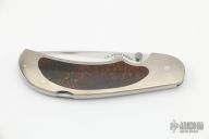 This interframe lockback by Tommy Overeynder features a mirror polished blade with false top edge, blade is dated 1997 and #001. The handle has a high satin finished nickel silver frame with stabilized bone inlays, (could be mammoth bone, spongy giraffe leg bone, etc) stainless steel backspacer. Comes with a zippered pouch. Nice lockup and blade seating. Has a couple very light scratches, otherwise excellent condition.