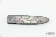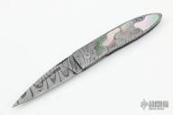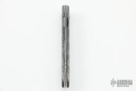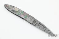 This Interframe Linerlock by Steve Jernigan features a Damascus blade with a nail nick and fullers. The handle has a Damascus frame with black lip pearl inlays, Damascus pivot collars, interior of frame is jeweled, Damascus backspacer. Nice detent, lockup and blade seating. Comes with zippered case. Excellent condition.