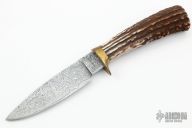 This Hunter by Master Smith Harvey Dean features a Damascus blade with notched thumbrest, .180" blade stock and 1.096" blade depth, hidden tang construction. The handle has a bronze guard and stag grip. Comes with a zippered case. Excellent condition.