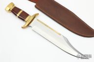 This bowie by John Nelson Cooper features a satin finished clip point blade with a sharpened top edge and brass Parry guard, .221" blade stock and 2.480" blade depth, hidden tang construction. The handle has a brass guard, butt and spacer with brown canvas micarta grip. Comes with a brown leather sheath and a zippered case. Has some light scratches, otherwise excellent condition.