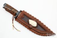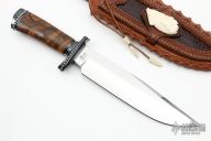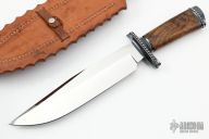 This Bowie by D'Alton Holder features a mirror polished blade with false top edge, .245" blade stock and 1.770" blade depth, hidden tang construction. The handle features a blued steel guard with sterling silver ball inlays, matching butt, Turkish walnut grip. Comes with a custom Ron Welling sheath made for the cover of Knife Magazine, sheath has alligator skin inset and a carved bone concho. Excellent condition.