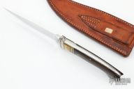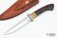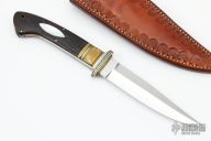 This small fighter by Lloyd Hale features a mirror polished blade with a false top edge, .246" blade stock and .914" blade depth, full tapered tang construction. The handle has a nickel silver guard that is fileworked and has dovetailed brass bolsters, wood scales with fileworked nickel silver liners, silver wire inlay on one side and mother of pearl inlays on the other side, lanyard hole. Comes with a hand tooled brown leather sheath and a zippered case. Excellent condition.