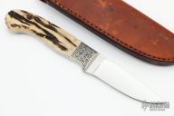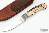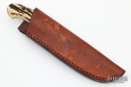 This knife by Jim Hardenbrook features a mirror polished drop point blade with .126" blade stock and .902" blade depth, full tapered tang construction. The handle has engraved nickel silver bolsters with stag scales. Comes with a brown leather sheath and a zippered case. Excellent condition.