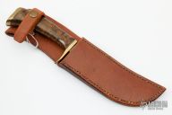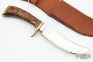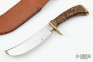 This Skinner by Master Smith Bill Moran features mirror polished upswept blade with .241" blade stock and 1.286" blade depth, hidden tang construction. The handle has a brass guard and butt with beautiful curly maple grip. Comes with a brown leather sheath and zippered case. Has a little patina and a few light scratches, otherwise excellent condition. Made in Lime Kiln MD.