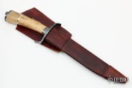 This bowie by Chester Darcey features a Damascus blade with false top edge, .201" blade stock and 1.447" blade depth, hidden tang construction. The handle has a Damascus guard, collar and butt with an oosic grip. Comes with a brown leather sheath and a zippered case. Excellent condition.