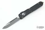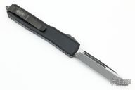 This Ultratech OTF automatic by Microtech features a S/E DLC stonewash finished blade with a standard edge. Black aluminum frame with black hardware and stainless steel clip. Glass breaker. Comes with original box and papers. New from the 2022 Blade Show.