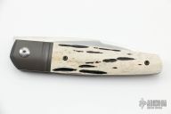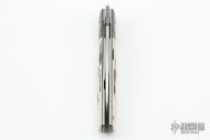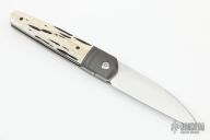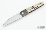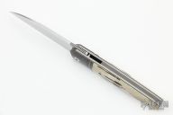 This Gentleman Front Flipper by Maxime Belzunce features a hand rub satin finished blade with notched thumbrest and front flipper. The handle has titanium fluted bolsters, jigged bone scales, bead blasted titanium liners, titanium backspacer. Nice detent, lockup and blade seating. Comes with a zippered case and COA. New from maker at the 2022 Blade Show.
