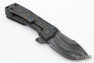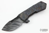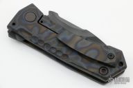 This VIS Metro Tac framelock flipper by Crusader Forge features a KG 2418 Ti coated blade with a milled fuller and flipper. The handle has a flamed or "Phantom" finished titanium frame and matching titanium clip positioned for tip up carry. Nice lockup and blade seating. Excellent Condition.