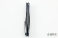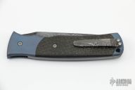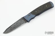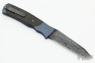 This large tactical automatic from Z Custom Knives features a Damascus blade. The handle as a bead blasted and anodized titanium frame, Damascus tip up clip, carbon fiber inlays, bead blasted stainless steel backspacer, lanyard hole at the butt. Nice lockup and action. Has a couple light scuffs on the frame, otherwise excellent condition.