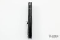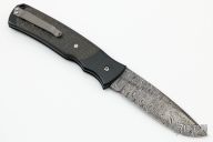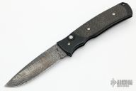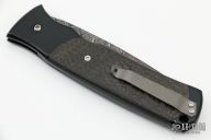 This large tactical automatic from Z Custom Knives features a Damascus blade. The handle as a black coated titanium frame, bead blasted titanium tip up clip, carbon fiber inlays, black stainless steel backspacer, lanyard hole at the butt. Nice lockup and action. Excellent condition.