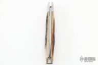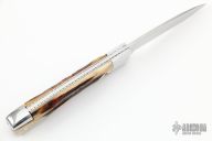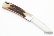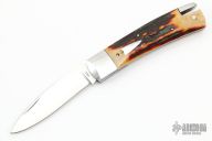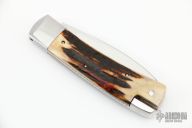 This Tail Lock by Tobin Hill features a hand rub satin finished blade with a nail nick. The handle features pinched stainless steel bolsters, stainless steel liners with fileworked spines, stag covers, stainless steel spring and tail lock. Includes a padded zippered case. Has a few very light scratches, otherwise excellent condition.