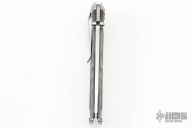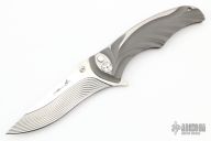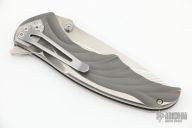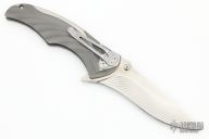 This Tighe Coon button lock flipper features a satin finish blade and fully sculpted bead blasted titanium frame. Titanium clip, tip down carry. Smooth and fast flipper opening that requires no wrist action. Nice blade seating and lockup. Comes with zippered case. Has a couple very light scuffs, otherwise excellent condition.