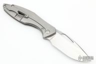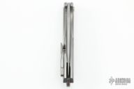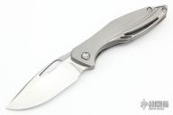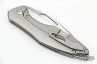 This Arius Style 55 Non-Flipper by Koenig knives features a hand rub satin finished blade with thumbhole. The handle has a bead blasted and milled titanium frame with Style 55 Milling, titanium backspacer and tip up clip with hidden screws. Has ceramic bearings and a ceramic detent ball. Nice detent, lockup and blade seating. Comes with original box and COA dated May 31, 2022. New from maker at the 2022 Blade Show.