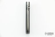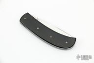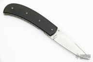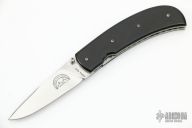 This Linerlock by Sidney "Pete" Moon features a hand rub satin finished blade with single thumbstud. The handle has black linen micarta scales, anodized titanium liners and a black linen micarta backspacer. Nice detent, lockup and blade seating. Has some scratches, has been resharpened, otherwise good condition.