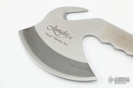 The Junglee Panda skinning axe pictured here is made entirely out of AUS 8 stainless steel. It measures 15 inches overall and sports a deep curved axe head with a 6 1/8 inch cutting edge. The rear of the head is slotted and sharp for cutting things like rope, wire and small branches. Along the front edge of the axe are the words Junglee Panda Skinning Axe.