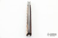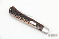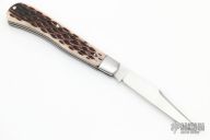This Slimline Trapper Slipjoint by Dwayne Chancellor features a satin finished blade with nail nick. The handle has stainless steel bolsters and liners, CPM154 steel spring and jigged bone covers with a stainless steel escutcheon. Has half-stop, flush in all positions. New from maker.