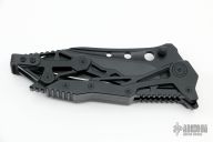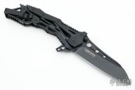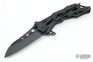 This QTR-12LT General Lee from Quartermaster Knives features a black blade with dual thumbstuds, notched thumbrest and flipper. The handle is comprised of black aluminum, black stainless steel tip up clip. This knife is a G&G Hawk design. Includes original box and papers dated 2-22-16 and #180/300. Excellent condition.