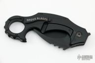 Introducing Brous Blade's first folding Karambit, The Enforcer. The Enforcer features 3D-machined black titanium scales. The aggressively shaped talon blade is made from D2 tool steel. Jason has carefully designed the handle to fit your hand perfectly for standard or reverse grips. The one-inch finger hole works well for any size hands. The Enforcer has a full G10 backspacer with a raised gear pattern for maximum grip. The top flipper design gives this knife one of the fastest and strongest actions we have ever made. The specially designed liners are skeletonized to reduce weight without compromising strength. The Enforcer utilizes the proprietary Brous Bearing System for a smooth and quick deployment. The pocket clip is right hand carry only and leaves the finger hole exposed for quick access. Has some light scuffs, otherwise excellent condition. Comes with a zippered case.