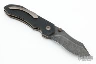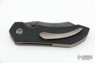 This Mini A by Koert Knives features a dark tumbled blade with dual thumbstuds. The handle has black canvas micarta scales, anodized titanium liners, matching backspacer and a tip up clip with hidden screws. Rides on bearings, nice detent, lockup and blade seating. Comes with zippered case. Excellent condition.