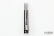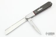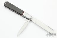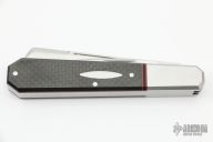 This XL Barlow by Bill Ruple features two hand rub satin finished blades with nail nicks. The handle has satin finished stainless steel bolsters, carbon fiber covers with red liners and red/black spacers, stainless steel escutcheon, liners and springs. Has half-stops, flush in all positions. Comes with a zippered case. Has a few very light scratches, otherwise excellent condition.