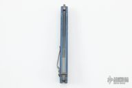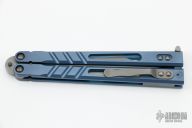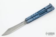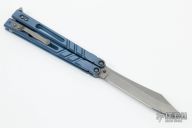 This Alpha Beast Balisong 3.0 from Blade Runner Systems (BRS) features a tumble finished clip point blade. The handle is milled and tumbled titanium with T latch on pommel. Excellent condition. Comes with original box and papers.