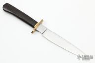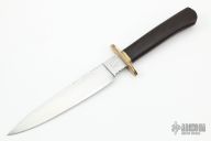 This Fighter by Master Smith JD Smith has a satin finished Wootz steel blade with fileworked spine, .161" blade stock and 1.224" depth, hidden tang construction. Handle has a fluted brass guard with a dark wood grip. Comes with a zippered case. Has some light scratches and some light patina, otherwise good condition.