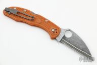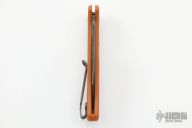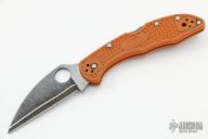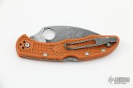 This Delica 4 by Spyderco has a custom acid stonewashed blade with thumbhole opener and notched thumbrest, blade is HAP40 with SUS410 Clading. The handle has burnt orange FRN scales and a 4-way reversible deep carry titanium clip. Has a couple light scuffs, otherwise excellent condition.