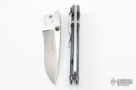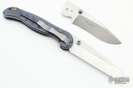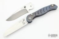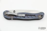 This Apogee by Darrel Ralph features a custom ordered sheepsfoot blade that has been reground by Tom Krein and is marked #1. Also comes with the original recurve blade that is marked #13. Both are Talonite with dual thumbstuds. The handle has an anodized titanium frame with a tip down bead blasted SS clip. This knife has some scuffs and scratches, it has been disassembled and one of the teflon washers was reinstalled incorrectly and damaged it, so now this knife is missing one teflon washer, otherwise good condition. Easy fix if you have some teflon washers.