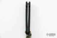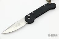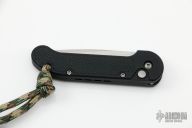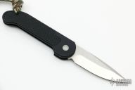 This Mini UDT by Microtech Knives features a satin finished plain edge blade. Dated 12/2013. Black aluminum frame with rubber inserts and lanyard hole. S/N 00634. Excellent condition.