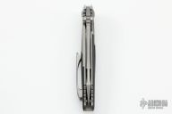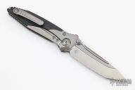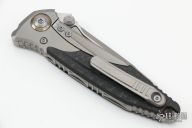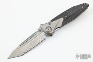This Socom Bravo by Microtech is made in China by Rike Knife, it features a bead blasted blade with a fully serrated edge, notched thumbrest, and dual thumbstuds. The handle has bead blasted titanium bolsters/liners, anodized pivot collars, carbon fiber scales. Tip up carry bead blasted titanium clip. Bead blasted titanium backspacer. Dated 04/2022 and s/n 0967. Comes with original box and papers. Box is signed by Marfione. Excellent condition.