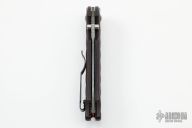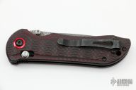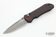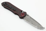 This Gold Class Stryker II from Benchmade features a drop point Odin Heim pattern Damasteel blade with swedge and dual thumbstuds. The handle is comprised of carbon fiber scales over blackened stainless steel liners and red anodized aluminum barrel spacers with matching pivot collar. Reversible tip up stainless steel pocket clip. Numbered #764on blade. Includes original box and paperwork. Excellent condition.